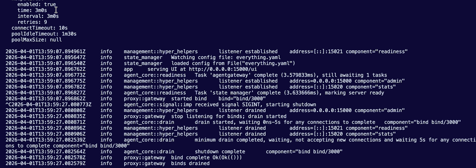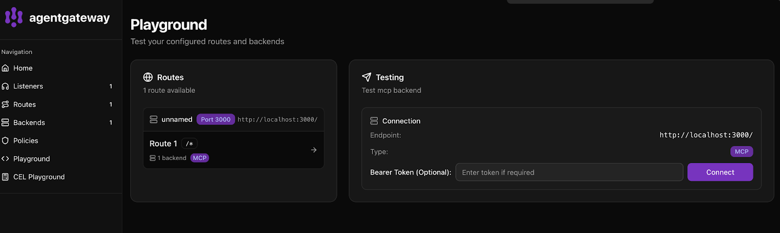 And you can now reach the agentgateway UI via: http://0.0.0.0:15000/ui