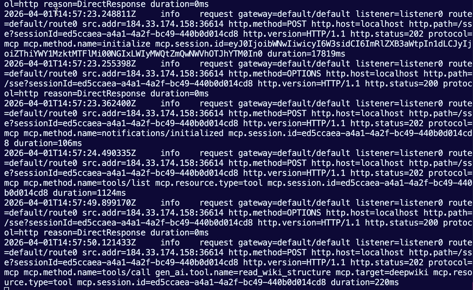 Within your terminal, you will see all of the output from connecting to and using agentgateway to route traffic to an MCP Server that’s a streamable HTTP MCP Server, so the traffic is going over the internet.