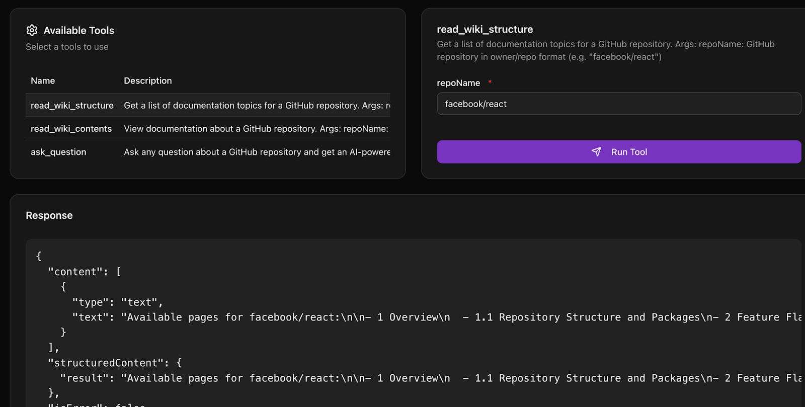 3. To test using one of the tools, click on `read_wiki_structure` and type in `facebook/react`.