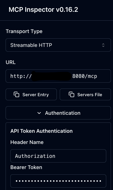 4. Within MCP Inspector, click on Authentication and add in the following:
